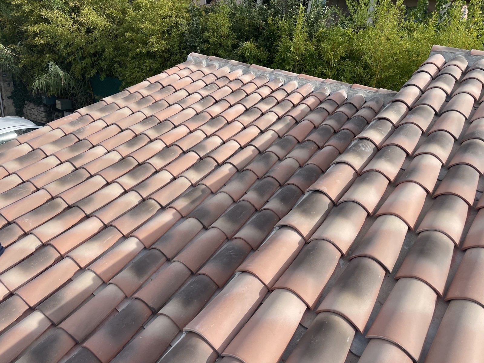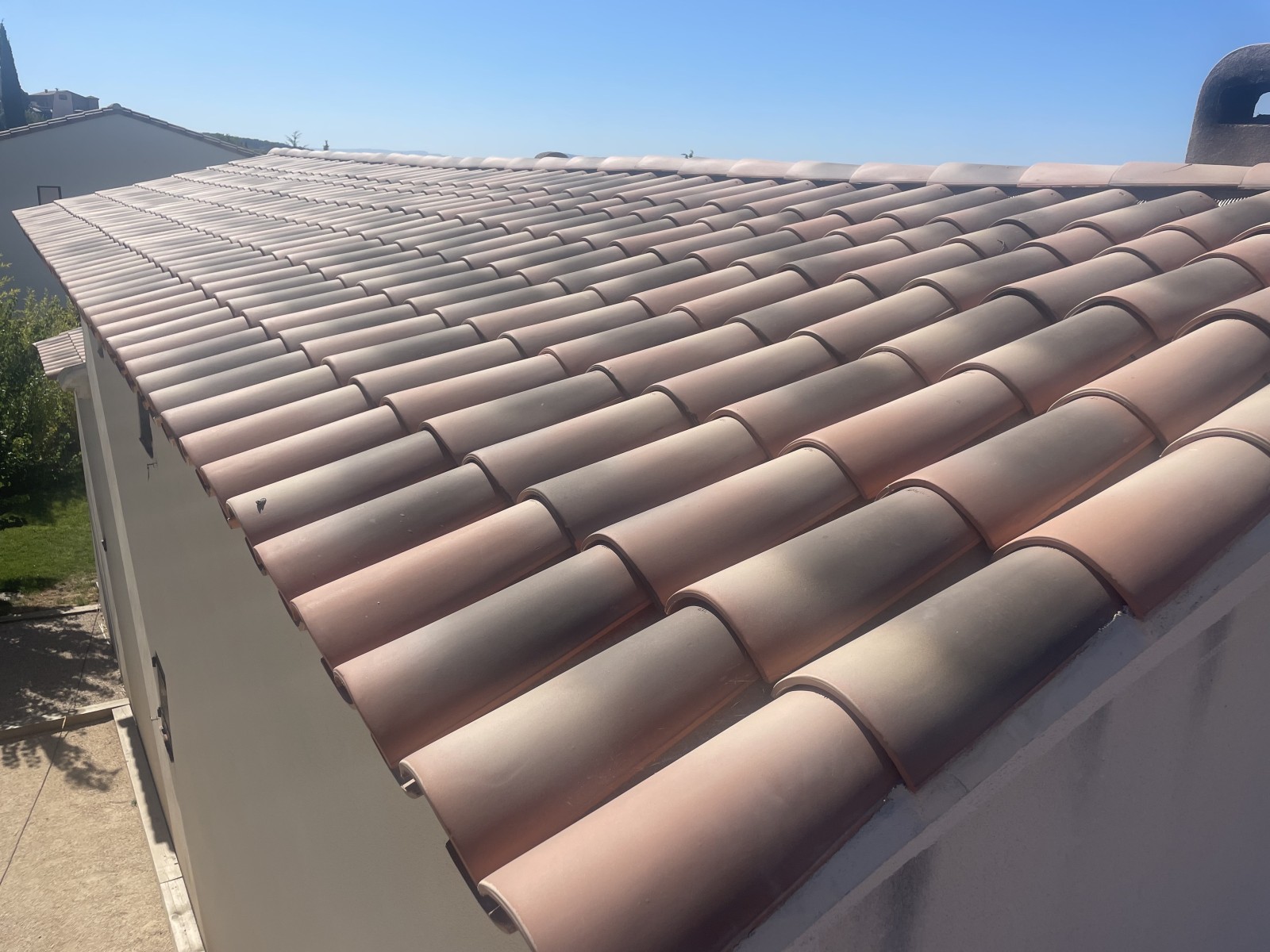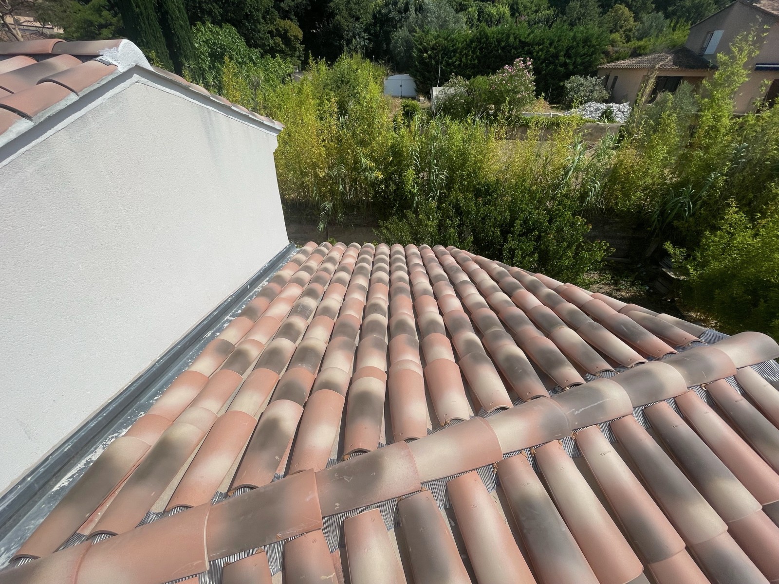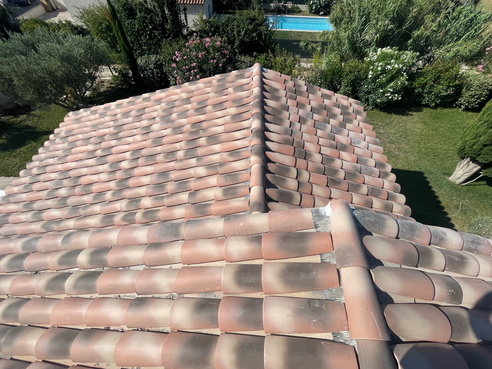 Nos interventions incluent la réfection des rives scellées avec tuiles Canal Silvacane et finition enduit ton pierre pour une toiture esthétique et durable.