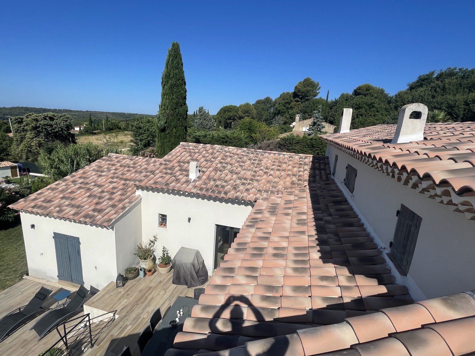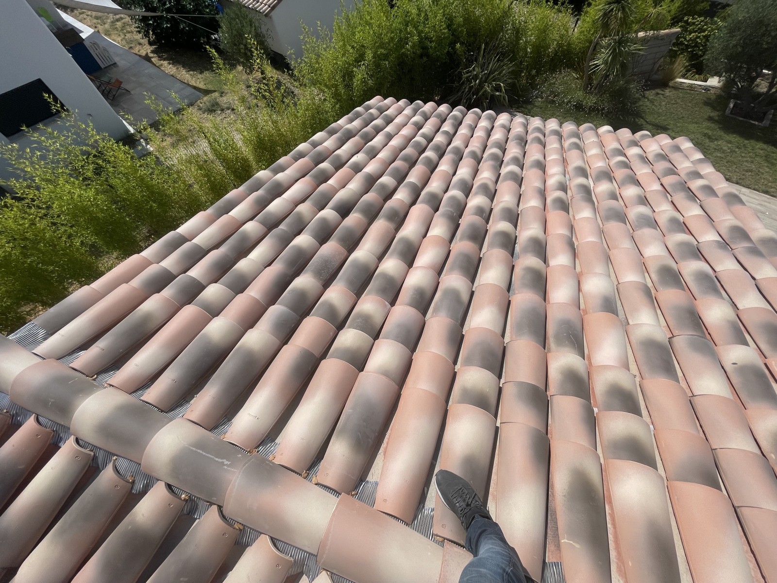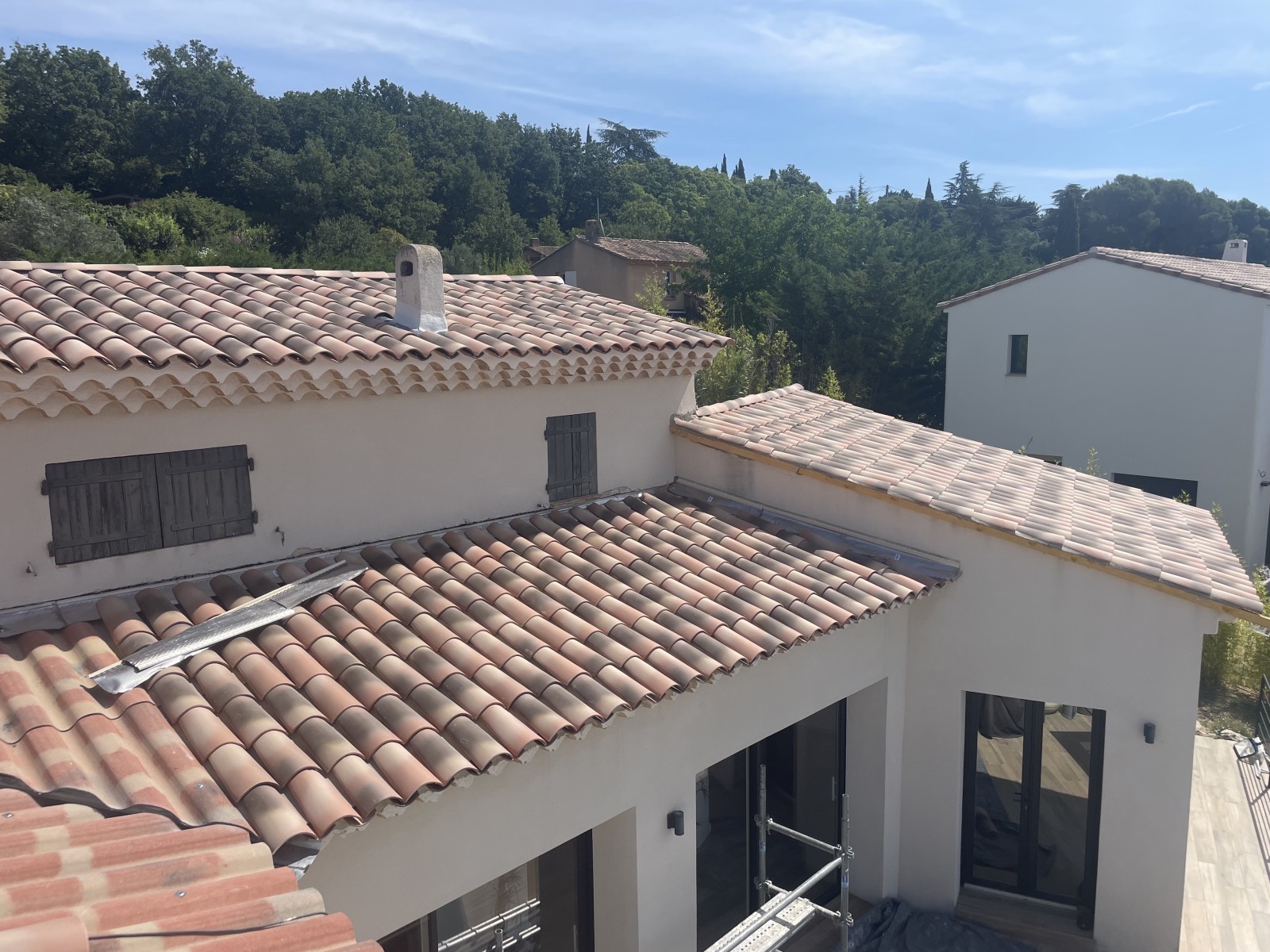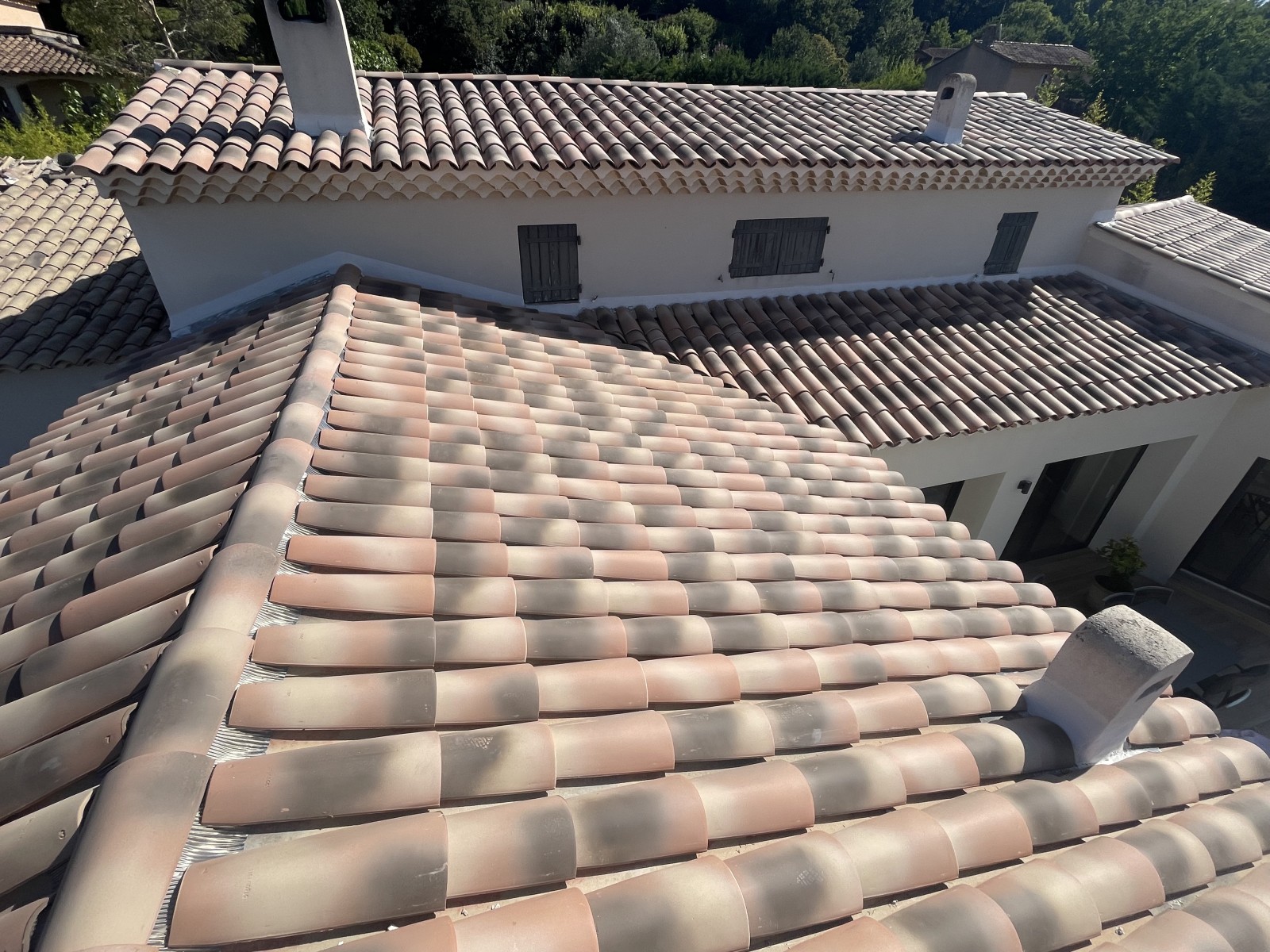 Nos interventions incluent la réfection des rives scellées avec tuiles Canal Silvacane et finition enduit ton pierre pour une toiture esthétique et durable.