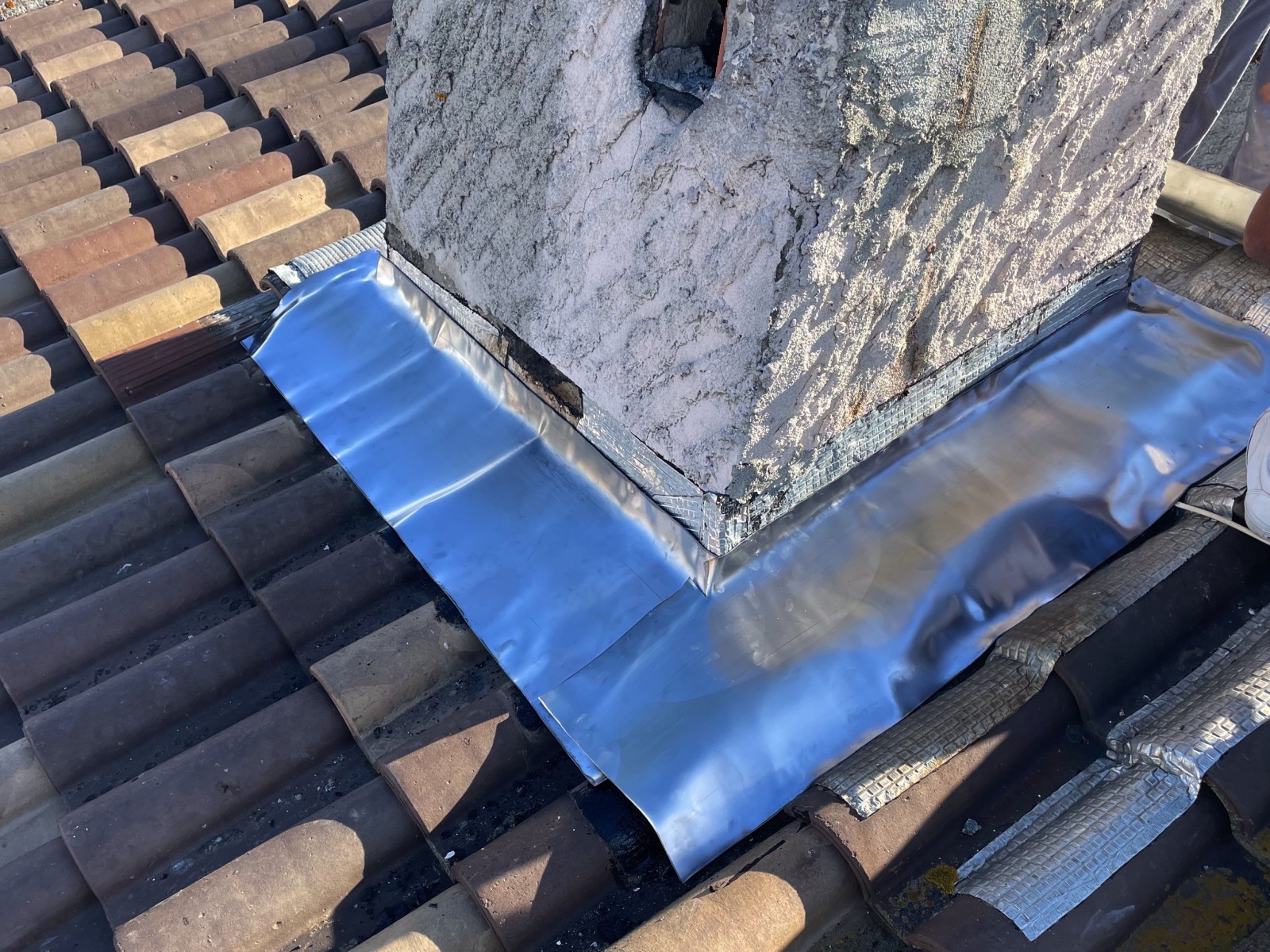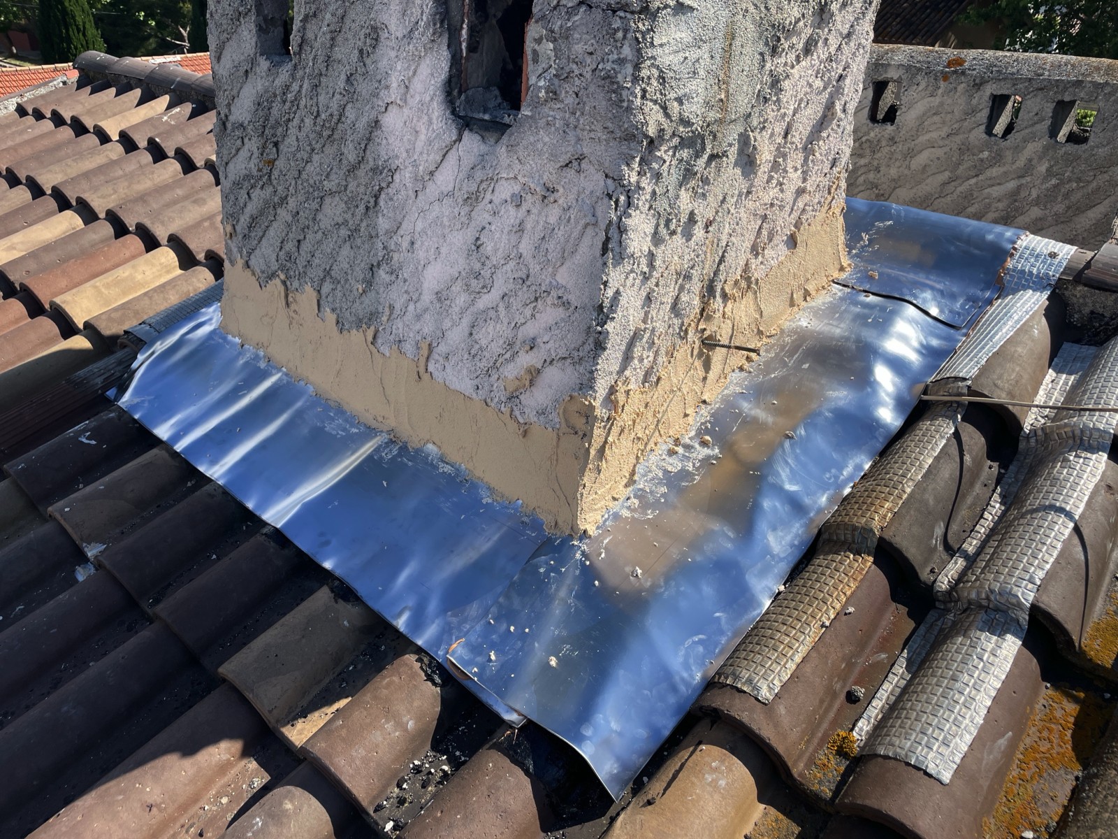 Le propriétaire de la maison nous a contacté car il avait une fuite causée par l’étanchéité vieillissante du tour de cheminée, Solin avec des tuiles cassées sur la toiture.