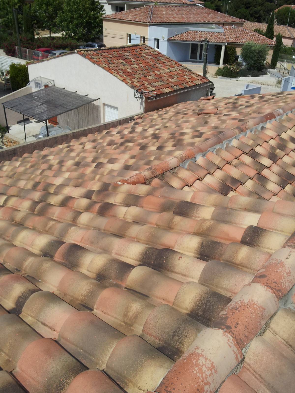Vous découvrez ici le démoussage complet d'une toiture sur Aix-en-Provence 13100 réalisé par Solutoiture votre partenaire en rénovation de toiture et isolation.