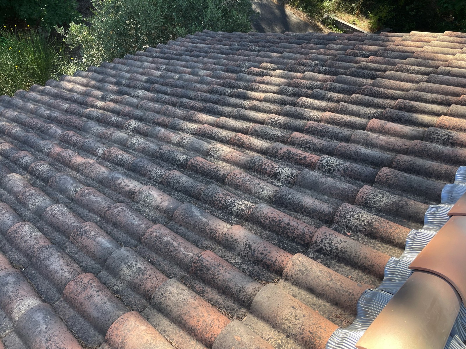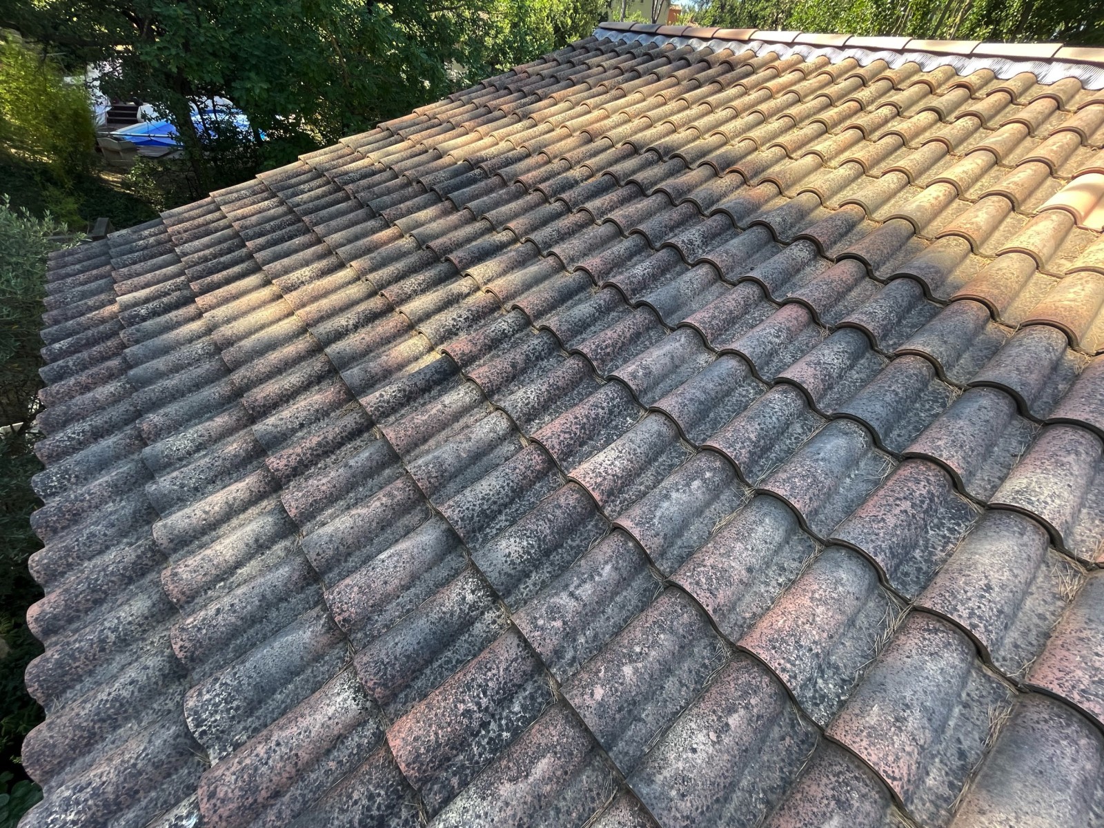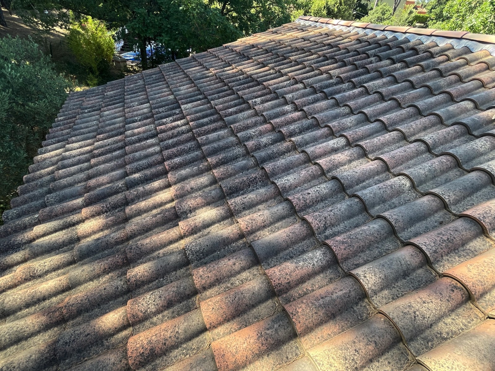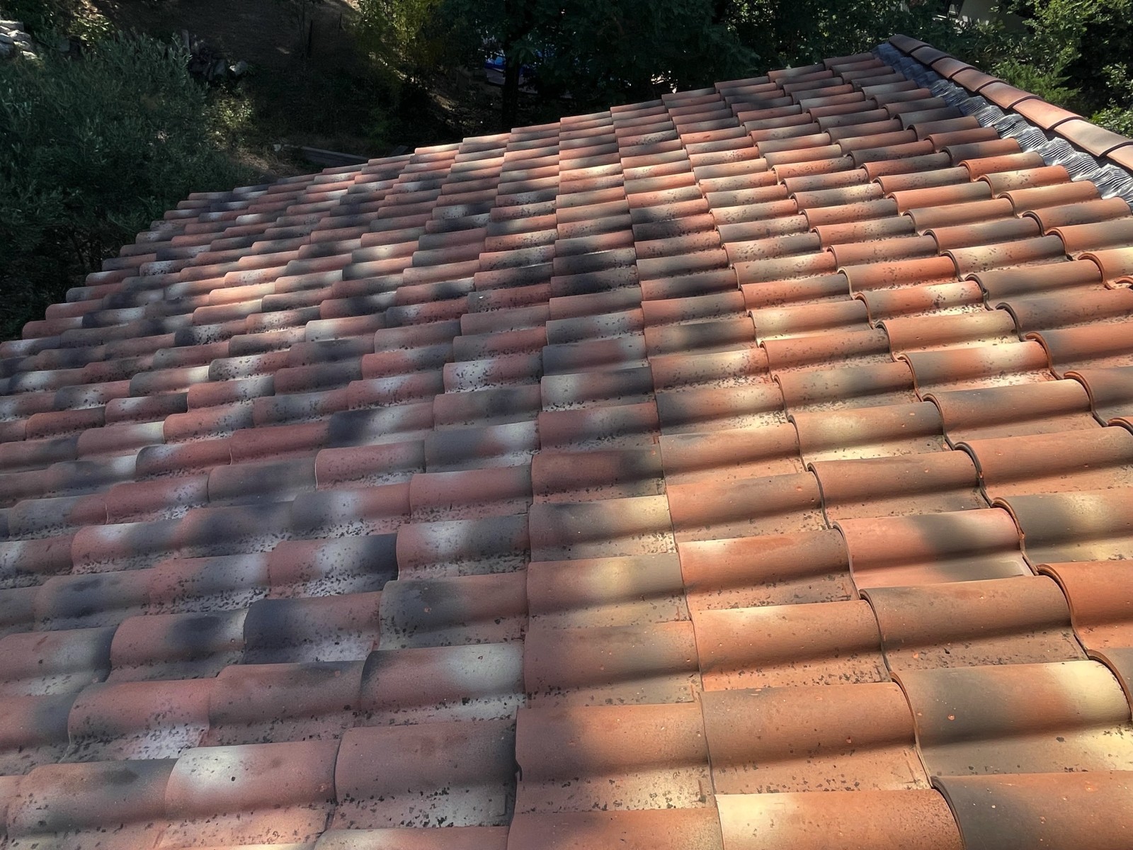 Le propriétaire nous à consulté car il avait des tuiles encrassées et chargée en mousse sur toute sa toiture.