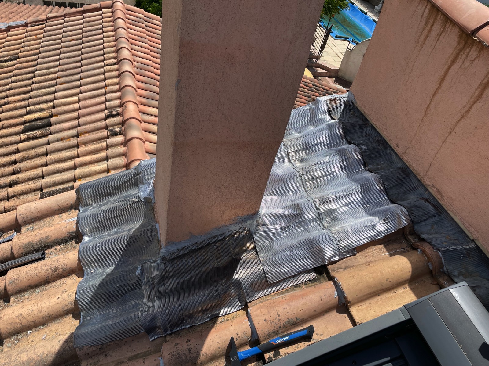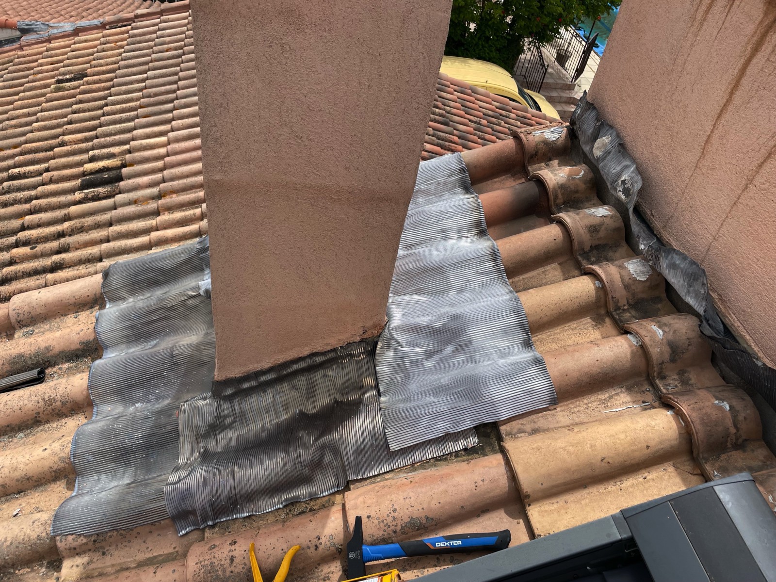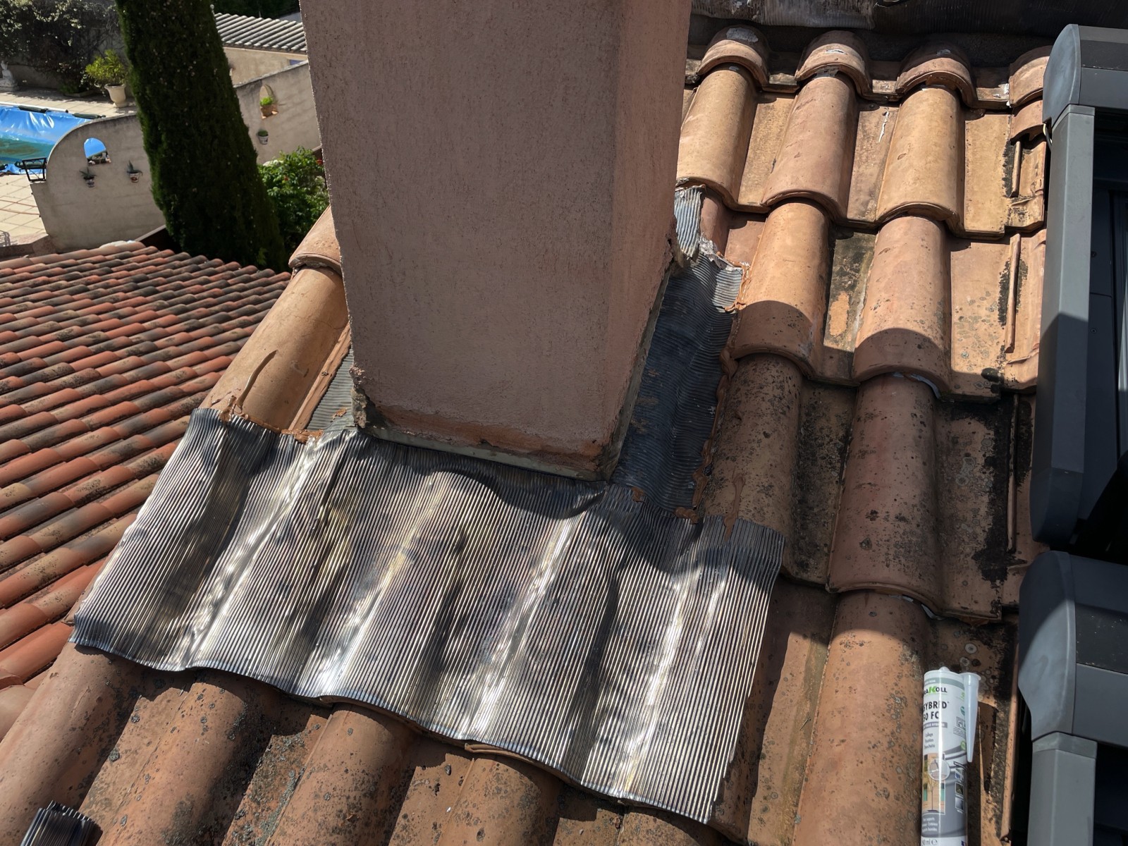 Le propriétaire de la maison nous a contacté car il avait une fuite causée par l’étanchéité vieillissante du tour de cheminée avec des tuiles décalées .