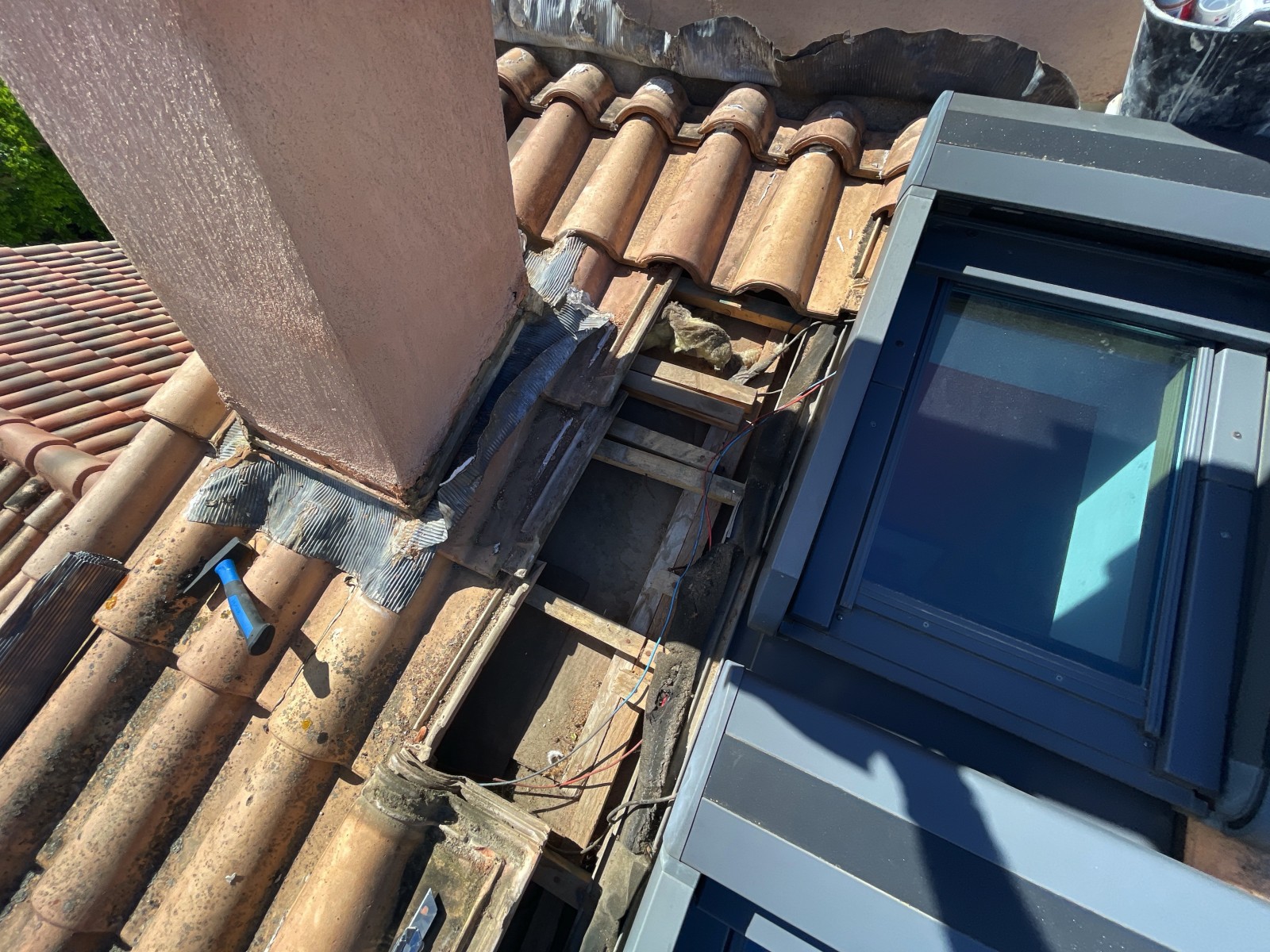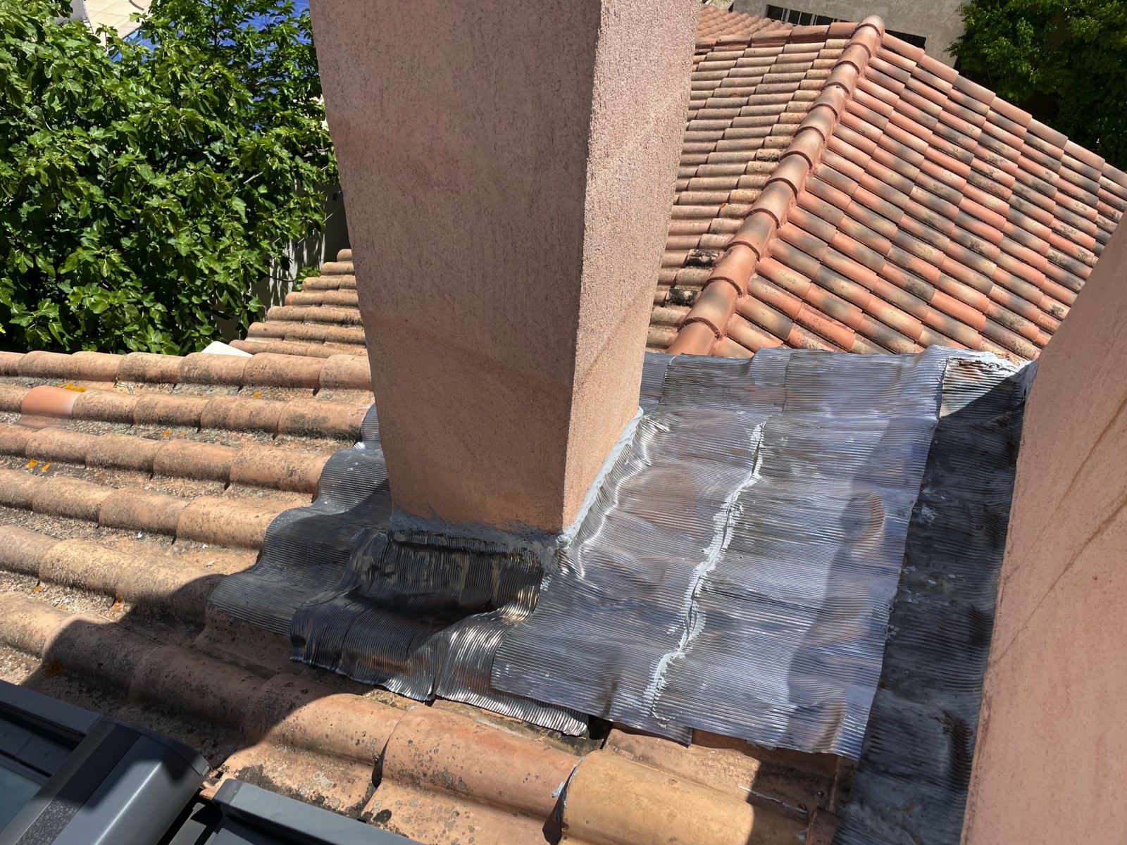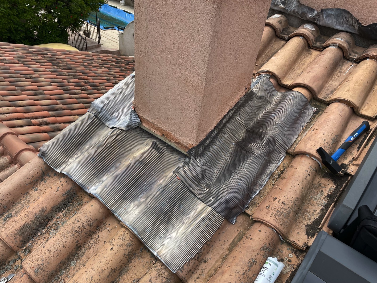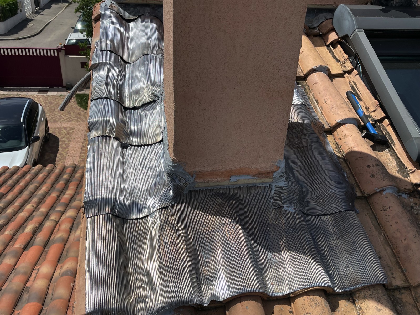 Le propriétaire de la maison nous a contacté car il avait une fuite causée par l’étanchéité vieillissante du tour de cheminée avec des tuiles décalées .