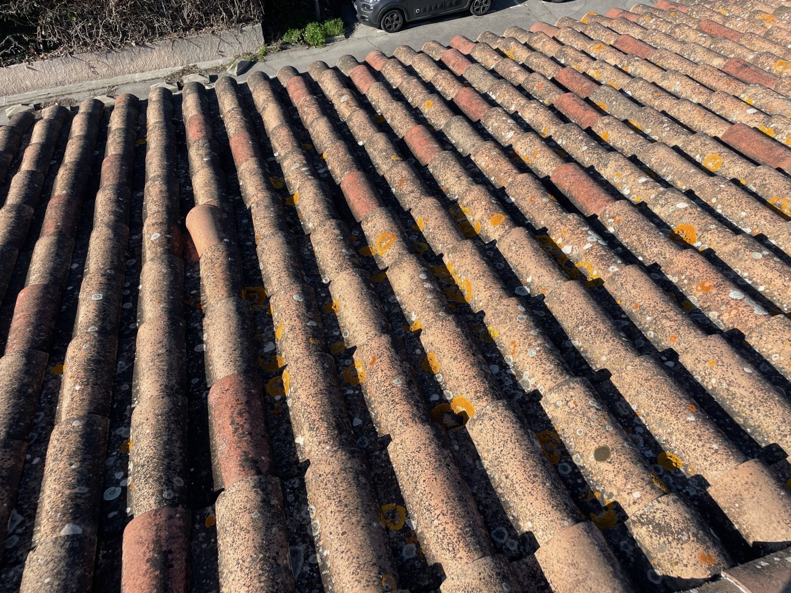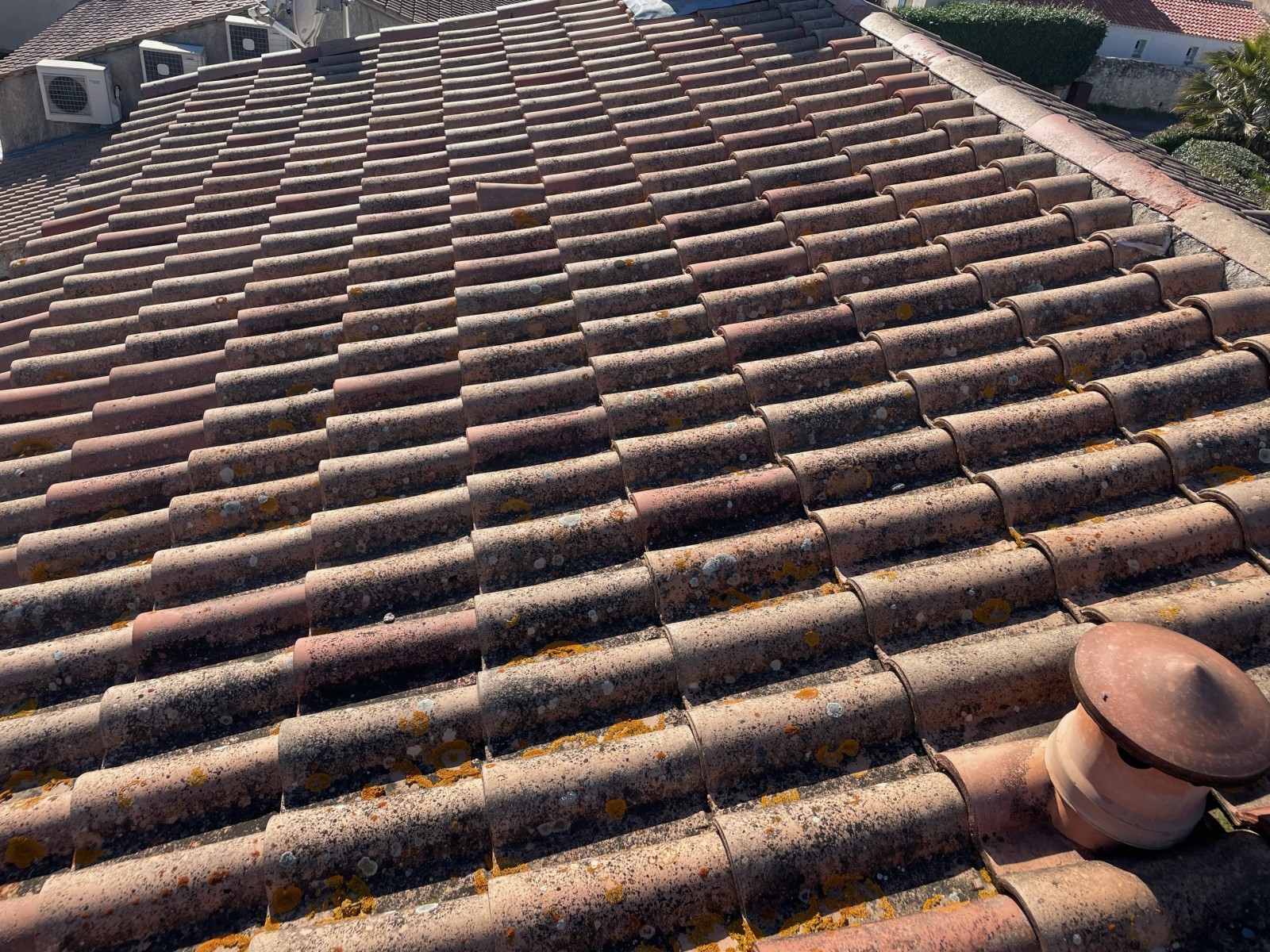 Une fois sur place nous avons pu constaté la présence de quelques tuiles cassées et des mousses et lichens sur l'ensemble du toit.