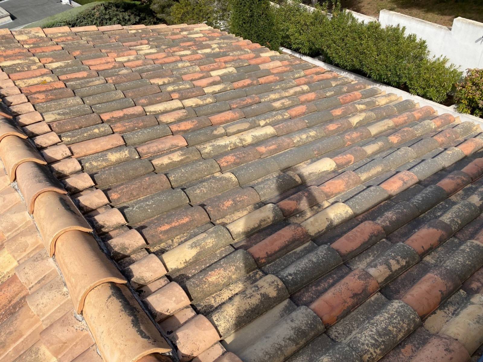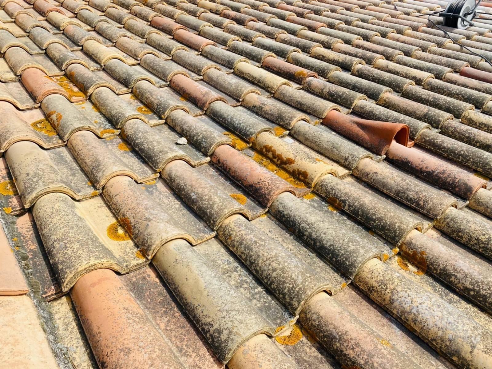 Une fois sur place nous avons pu constaté la présence de quelques tuiles cassées et des mousses et lichens sur l'ensemble de la toiture.